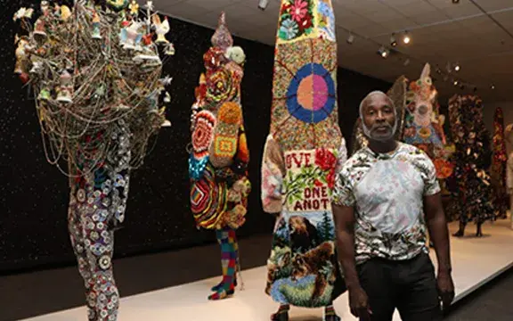 “By exploring themes of identity, humanity, equity, and social justice, Cave prompts viewers to consider their own civic responsibilities, imaginations, and aspirations, through a creative lens. His goal is to both inspire and empower, inviting people to look at one another without judgment,” said Museum Director Betsy Bradley.
