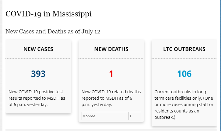 Additionally, one death was reported, in Monroe County, according to the Mississippi Department of Health.