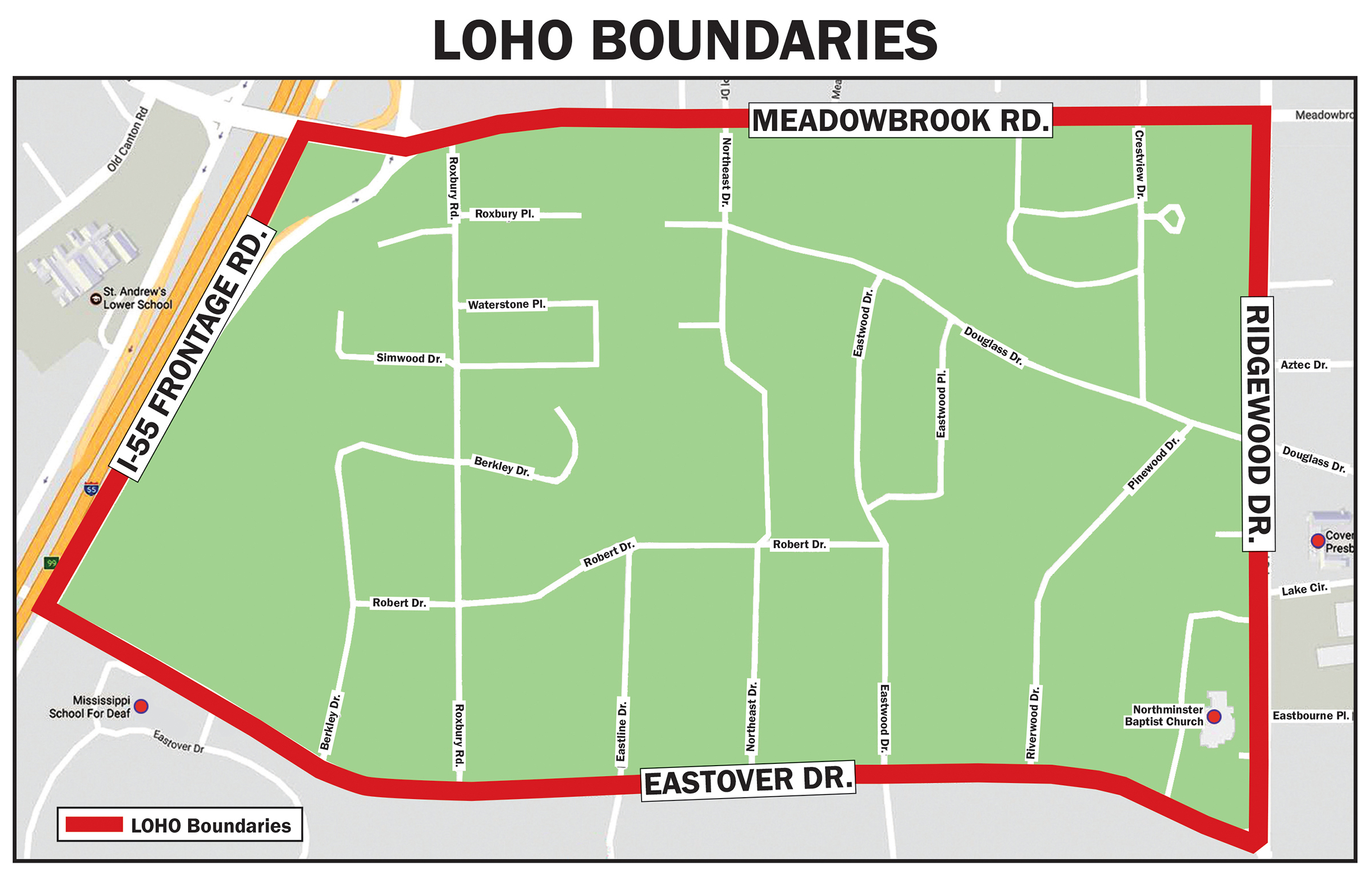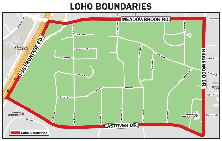 LOHO runs from Meadowbrook Road in the north to Eastover Drive in the south. It is bordered by the I-55 North frontage road to the west and Ridgewood Road to the east. Approximately 150 homeowners have joined the association.
