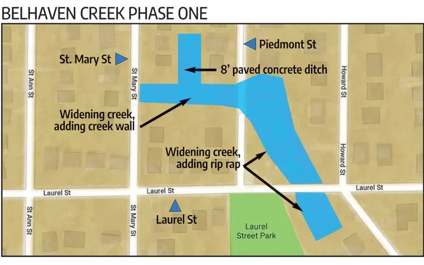 The roughly $2 million project includes widening the creek from St. Mary to Laurel Street. From St. Mary to Piedmont, the creek walls would be lined with concrete to prevent future erosion. And from Piedmont to Laurel, rip rap would be added, also to prevent erosion.