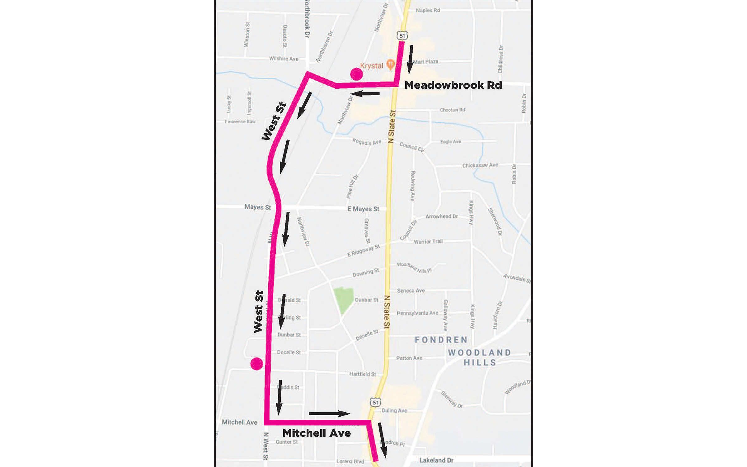 All southbound traffic will be detoured starting at Meadowbrook Road to West Street to Mitchell Avenue. Local access into the neighborhood can use Northview Drive to access residences.