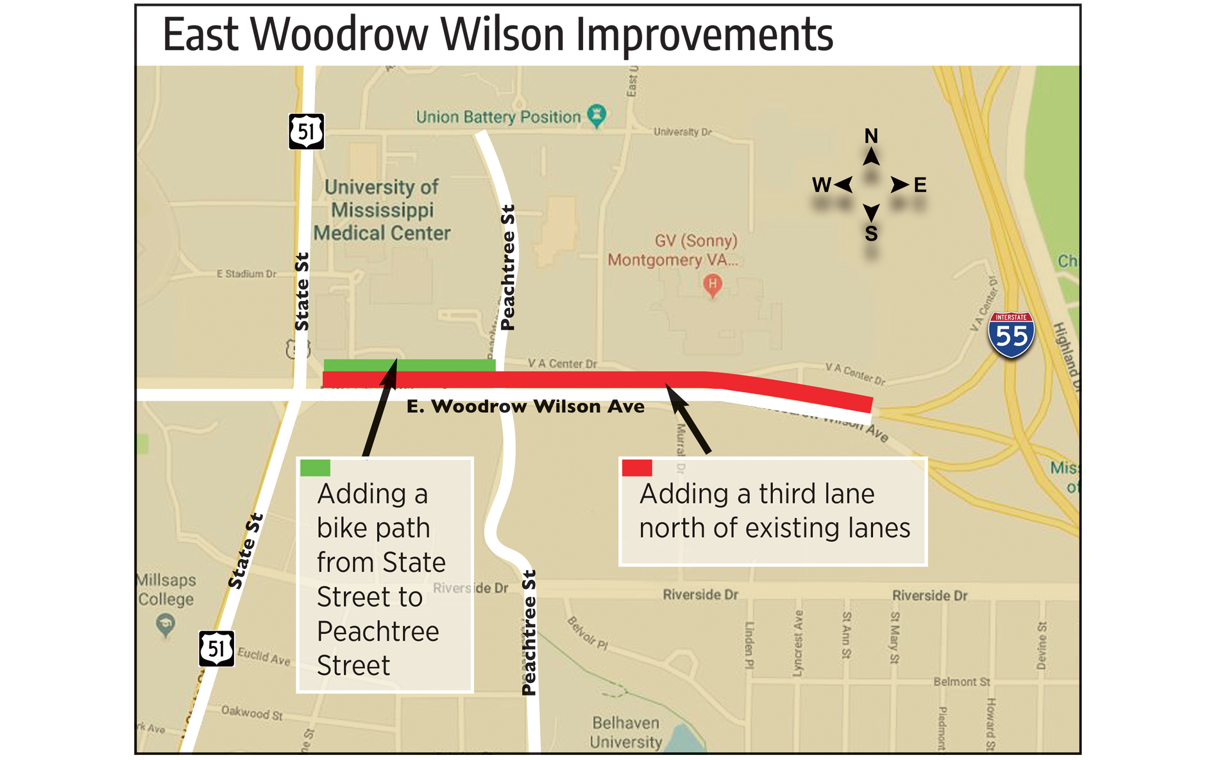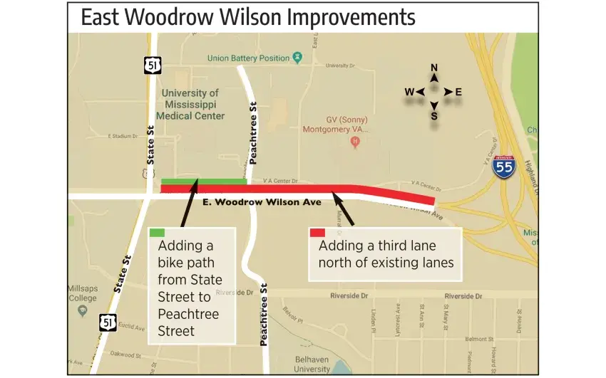Plans also include extending an existing bike trail from the North State/Woodrow Wilson intersection to Peachtree Street, installing new signalization at the Peachtree intersection and milling and overlaying the street also from I-55 to North State.
