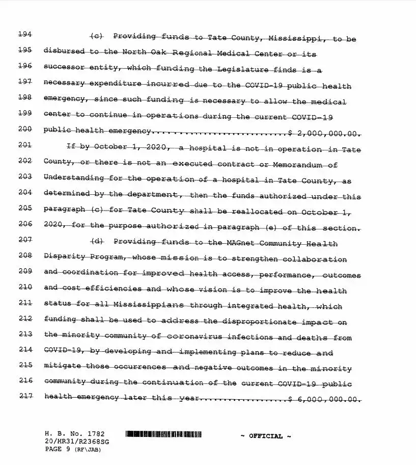 House Bill 1782 appropriated more than $222 million in CARES Act funds for the state Department of Health. Some of that was reserved for hospitals to compensate them for costs dealing with the COVID-19 pandemic and state Rep. Trey Lamar, R-Senatobia, secured $2 million in funding from the bill for a now-closed North Oak Regional Medical Center in his district.