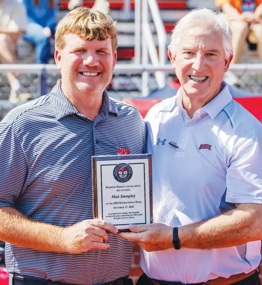 Madison-Ridgeland Academy honored Matt Stampley (left) as its 2025 Homecoming Hero, a tradition that began 10 years ago when a group of students wanted to recognize the faithful service of longtime custodian Leroy Sutton. Each year since, MRA has celebrated one of its own. This year’s honoree, Mr.