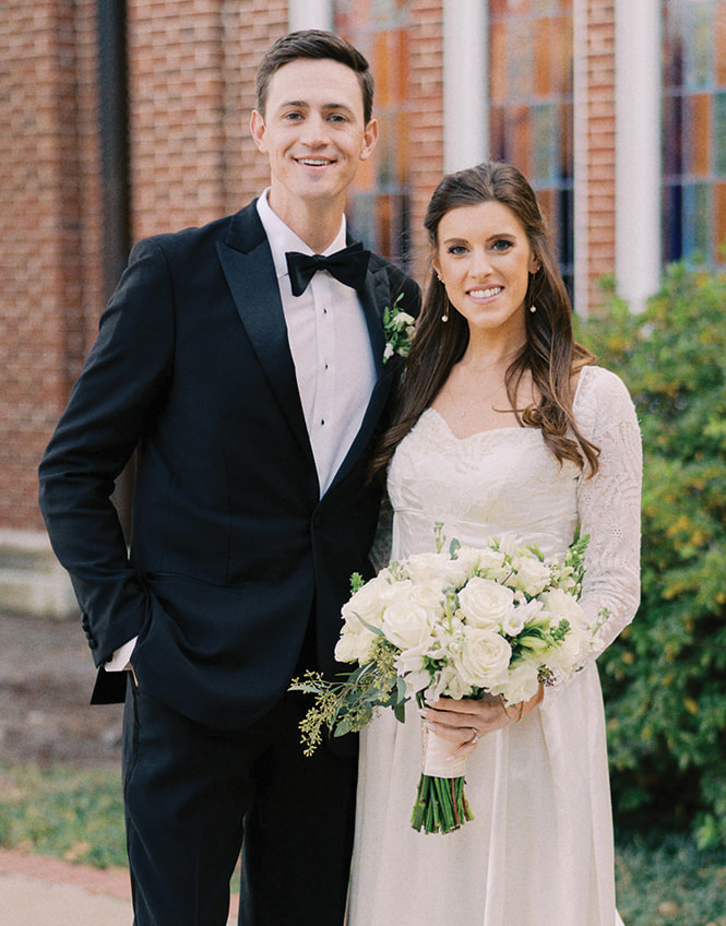 The couple chose December 27 as their wedding date to honor and share an anniversary with his parents, who celebrated their 38th anniversary that same day. Magnolia greenery and red berries provided the inspiration for the decor for the Paris Yates Chapel and the dinner following at the Oliver.