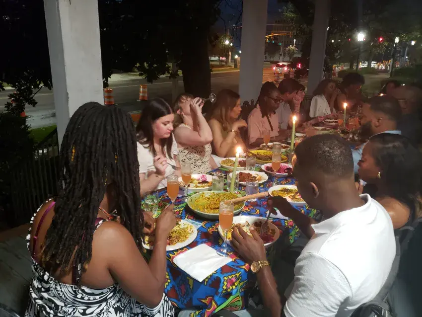 Sanza, alongside tour crew from Greensboro in North Carolina and two local chefs, graced the gallery with two course meals, including two meats, chicken and fish, cooked with careful detail with herbs, oil, spices, and seasonings including soy sauce. he also created several creative dishes with vegetarian and vegan options. His vegetable dishes, alongside his vegetable stew served with yoghurt, were inspired directly from the cuisine of South Africa and various other regional varieties of food across Africa.