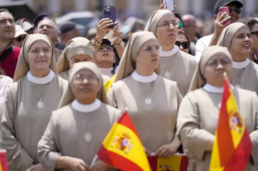 While his mood seemed uplifted to see the crowd below, including flag-waving nuns and tourists in sun hats on the hot, humid day, Francis turned somber as he noted that Tuesday marks World Refugee Day, an occasion promoted by the United Nations.