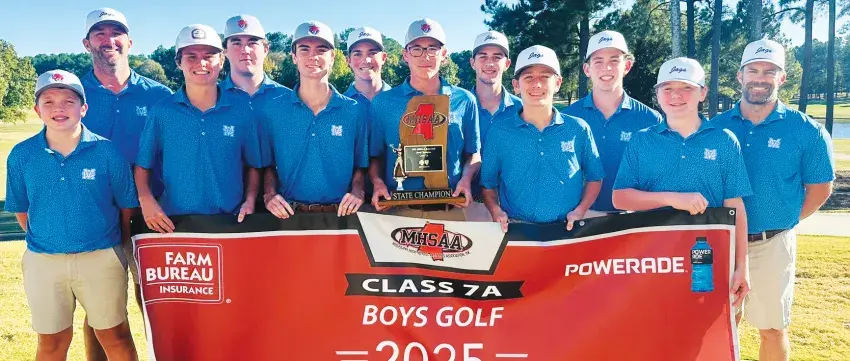 Madison Central High School’s boys golf team won the MHSAA 7A state championship. Team members include (from left) Collins Webber, Head Coach Todd Beach, Wright Taylor, Reid Beach, Gray Collins, Parker Winders, Tucker Gutierrez, Cash Jones, Ty Reeves, Kingston Hood, Anderson Roy, and Assistant Coach Michael McElroy.