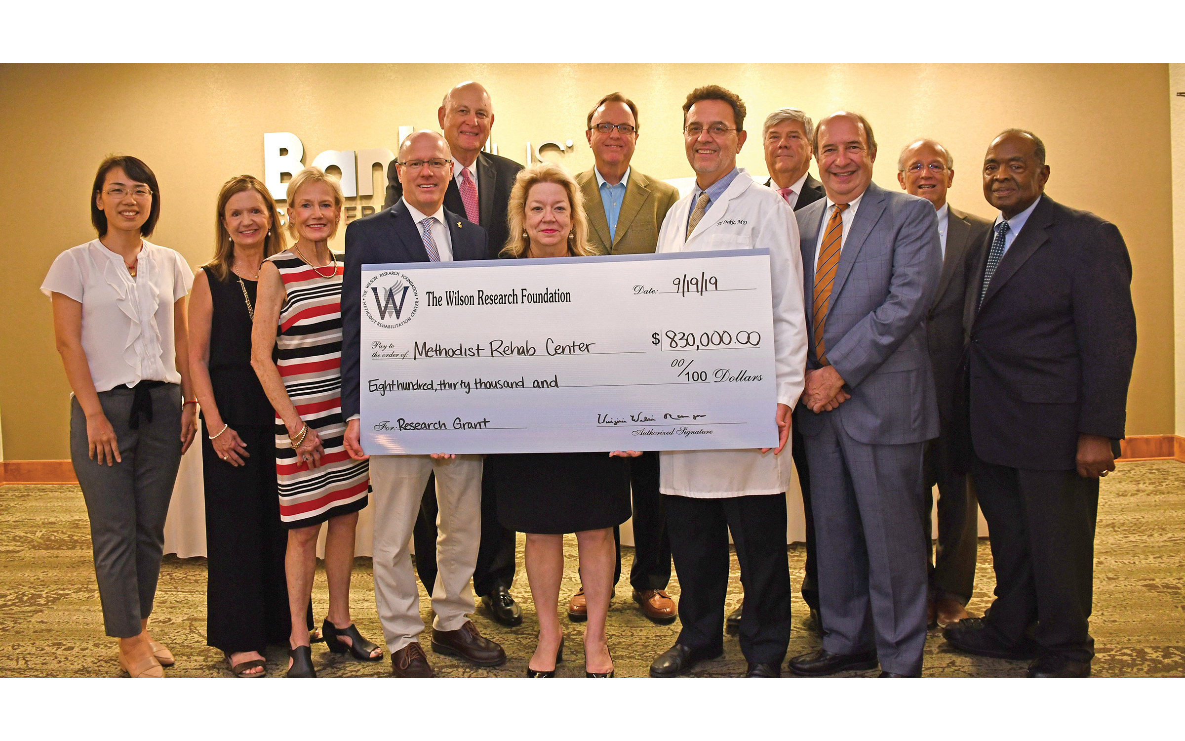The board of governors of the Wilson Research Foundation presented a grant in the amount of $830,000 to Methodist Rehabilitation Center. The donor-supported foundation serves as MRC’s fundraising arm, and the grant covers annual research and education initiatives to develop better treatments and outcomes for patients who suffer from a stroke, brain injury, spinal cord injury, amputation or other disabling condition. From left, Rita Sun, Kelley Fenelon, Katy Houston, Chris Blount, Gene Delcomyn, Ginny Mounger, Sam Lane, Dr. Dobrivoje Stokic, Matt Holleman, Cal Wells, Cy Rosenblatt and Dr. Robert Smith.