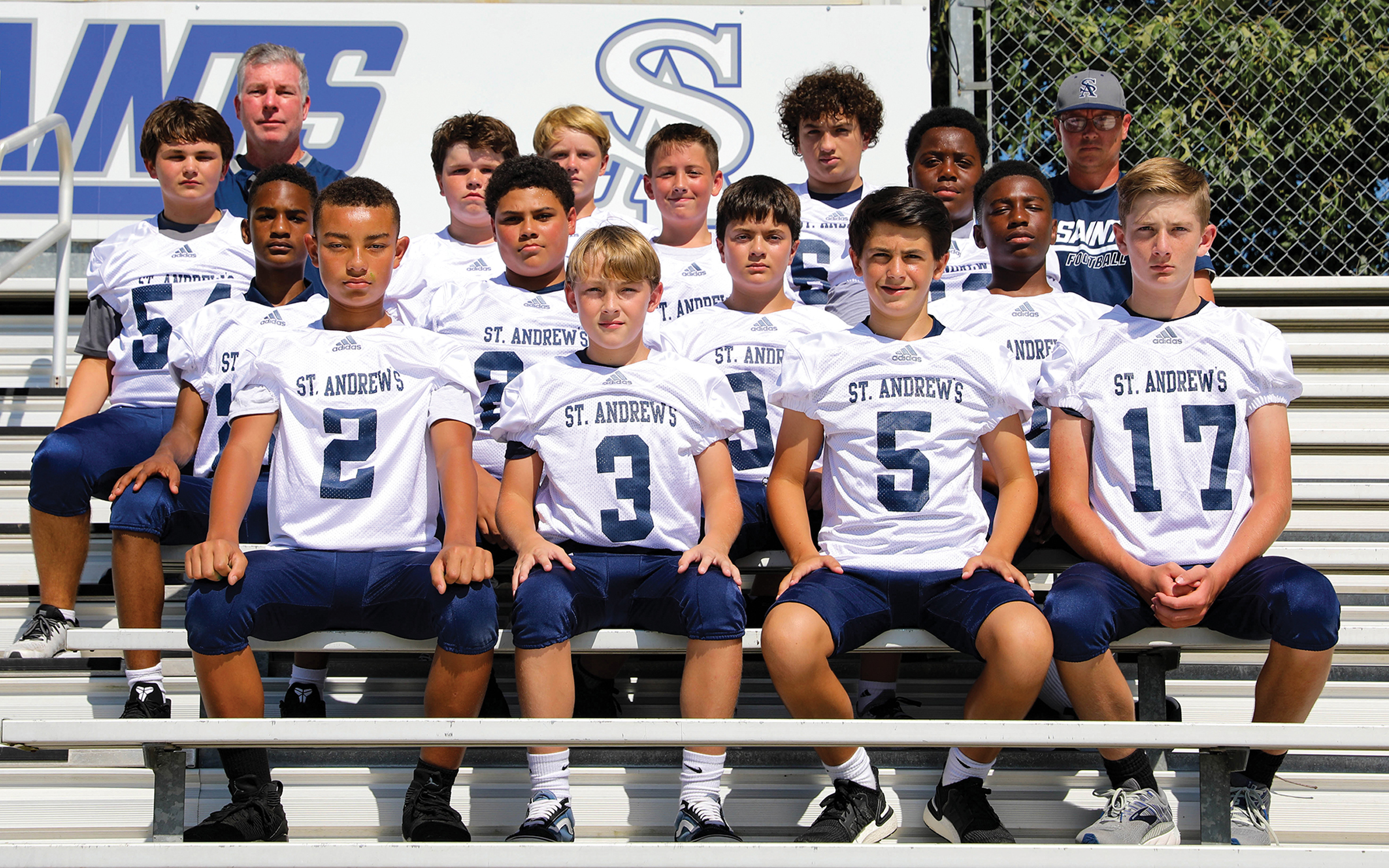 St. Andrew’s Episcopal School’s members of the 2019 seventh and eighth grade football team are (from left, back) Joe Ray, assistant coach, Cameron McCain, Charlie Johnson, Michael Timmer, head coach; (third row) Connor Young, Charlie Whittington, Holden Caraway, Larry Johnson; (second row) Thabani Maposa, Raymond Fraser, Austin Morgan, Daniel Byrd; (front) Jalen McMillan, Keith Thompson, Friend Walker, and Ryan Carpenter.