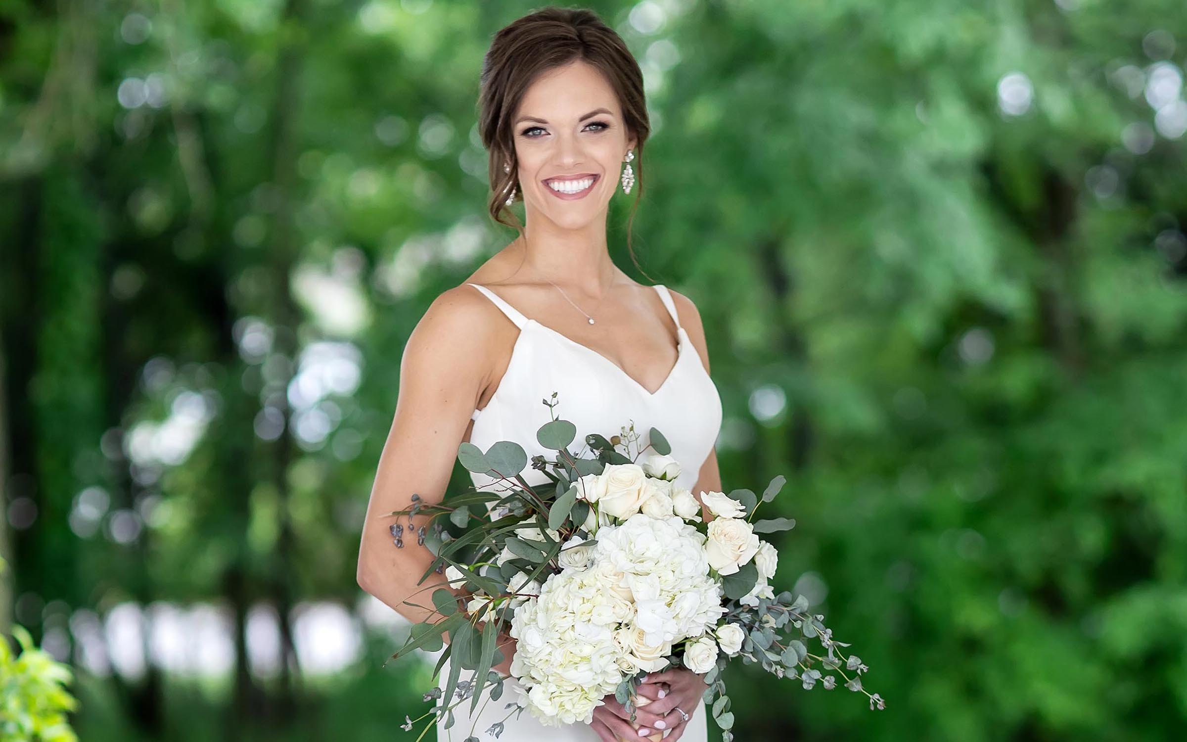 Due to rain showers, plans for an outdoor ceremony were shifted indoors at Bridlewood, which was decorated with all white floral, eucalyptus and candlelight. The bride’s entrance was through an antique doorway and frame constructed and assembled on-site by the bride’s aunt and uncle, Don and Stacy Bufkin of Phoenix, Miss.
