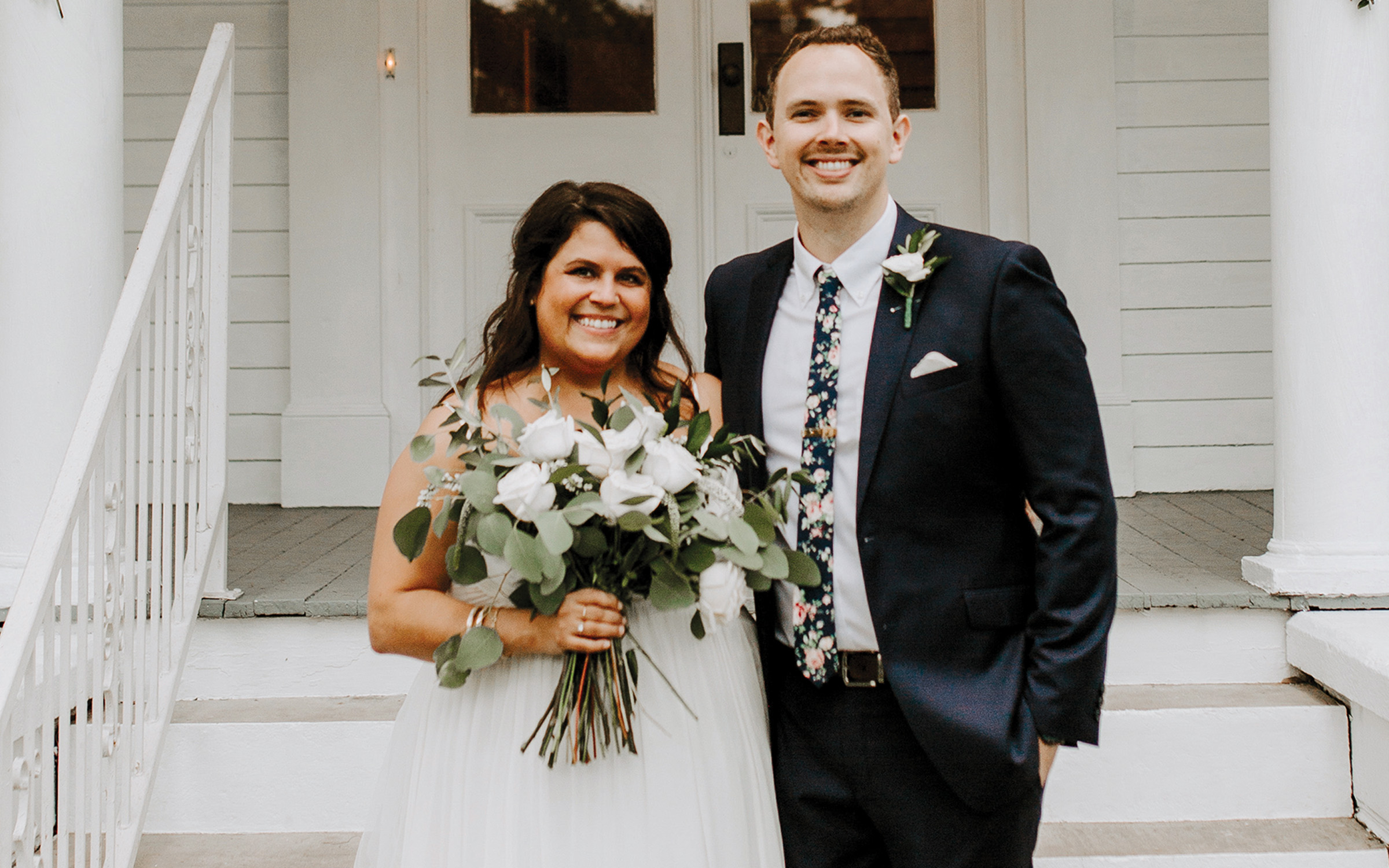 The ceremony was performed on the front steps of the family home featuring a backdrop of the historical white house with a wraparound porch, and garden chairs set out in rows underneath the trees. Arrangements and eucalyptus garland were prepared by the bride’s mother assisted by Pennye Dees and Tammie Haynes of Jackson.