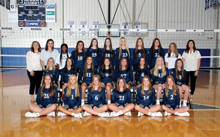Playing for the five-time state champion Lady Raiders varsity and JV volleyball program are (from left, back) Coach Ashley Zamjahn, Coach Spencer Pittman, Manager Alecya Berry, Remy Jones, Mary Grace Foster, Ava Ladner, Anna Claire Sheffield, Hannah Towery, Emma Robertson, Manager Jane Saxon Braswell, Head Coach Melissa Denson; (second row) Cami