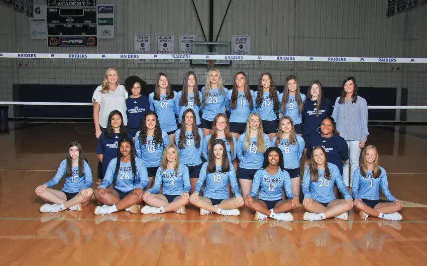 Playing for the 2019-2020 Lady Raiders volleyball team at Jackson Academy are (from left, back) Coach Ashlyn Raybon, Dajionae Weathersby, Emma Robertson, Hannah Towery, Anna Claire Sheffield, Parker Bracken, Anna Katherine Ray, Natalie DeRusso, Fran Wilkirson, Head Volleyball Coach Melissa Denson; (second row) Karma Oberholzer, Remy Jones, Pryor