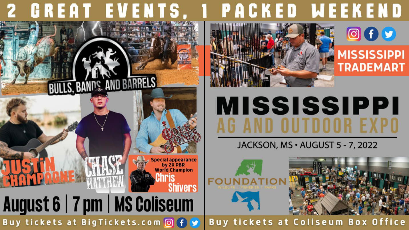 The Mississippi Ag and Outdoor Expo, hosted by The Foundation for Mississippi Wildlife, Fisheries, and Parks and presented by Southern AgCredit, will be held at the Mississippi State Fairgrounds from Friday, August 5, through Sunday, August 7, in the Trade Mart. Joining the Expo will be the exciting Bulls, Bands and Barrels event, scheduled for 7:00 p.m. on Saturday, August 6, at the Mississippi Coliseum. Featuring rising country music star, Chase Matthew along with Justin Champagne and Cole Jones, Bulls, Bands and Barrels promises to be an unforgettable experience. World renowned championship cowboy Chris Shivers will be a featured guest participant at Bulls, Bands and Barrels.