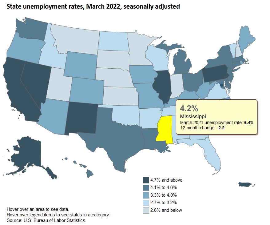 The current unemployment rate for Mississippi (as of March 2022) stands at 4.2 percent.