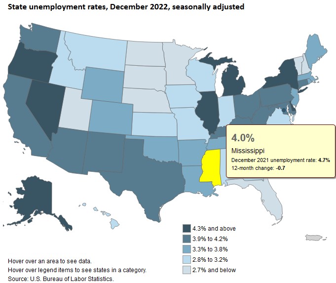 The current unemployment rate for Mississippi (as of December 2022) stands at 4.0 percent.