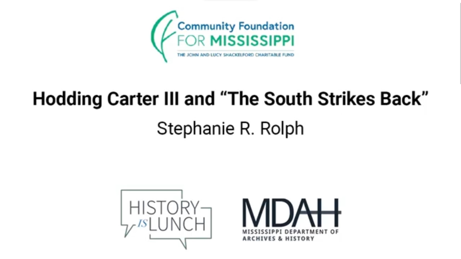 On July 13, Stephanie Rolph presented “Hodding Carter III and The South Strikes Back” as part of the History Is Lunch series.