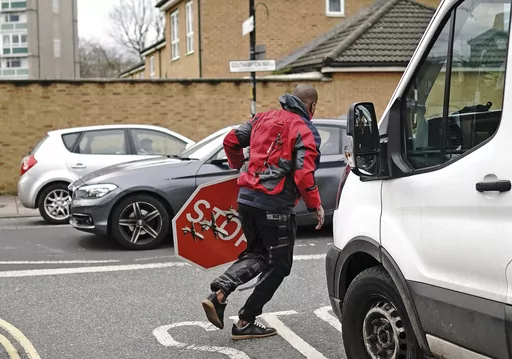LONDON (AP) — A man suspected of stealing an artwork by Banksy of a stop sign adorned with three military drones, was arrested Saturday, London police said.