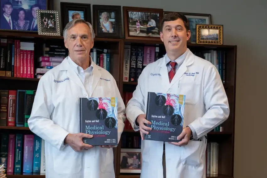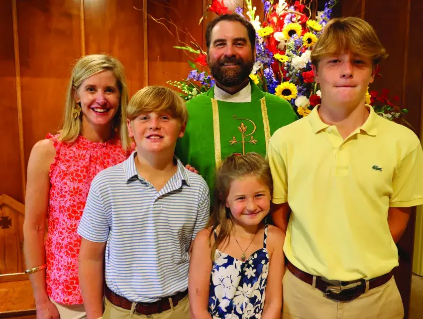 Children's of Mississippi patient Felton Walker, center, is surrounded by, from left, John Scarborough; Dr. Mary Taylor, Suzan B. Thames Chair and professor of pediatrics; father Chip Walker; mother Liz Walker; Children's of Mississippi CEO Dr. Guy Giesecke; child life manager Cara Williams; and Mary Beth Addington, UMMC clinical operations and special projects manager.