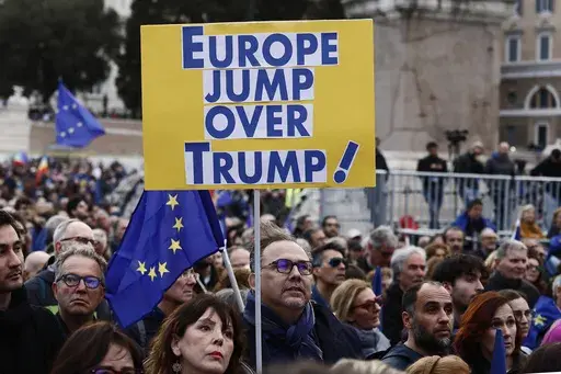 ROME (AP) — Tens of thousands of Italians joined a pro-Europe rally in Rome's city center Saturday, waving blue European Union flags in a sign of support and unity as a European push for rearmament divides the country.