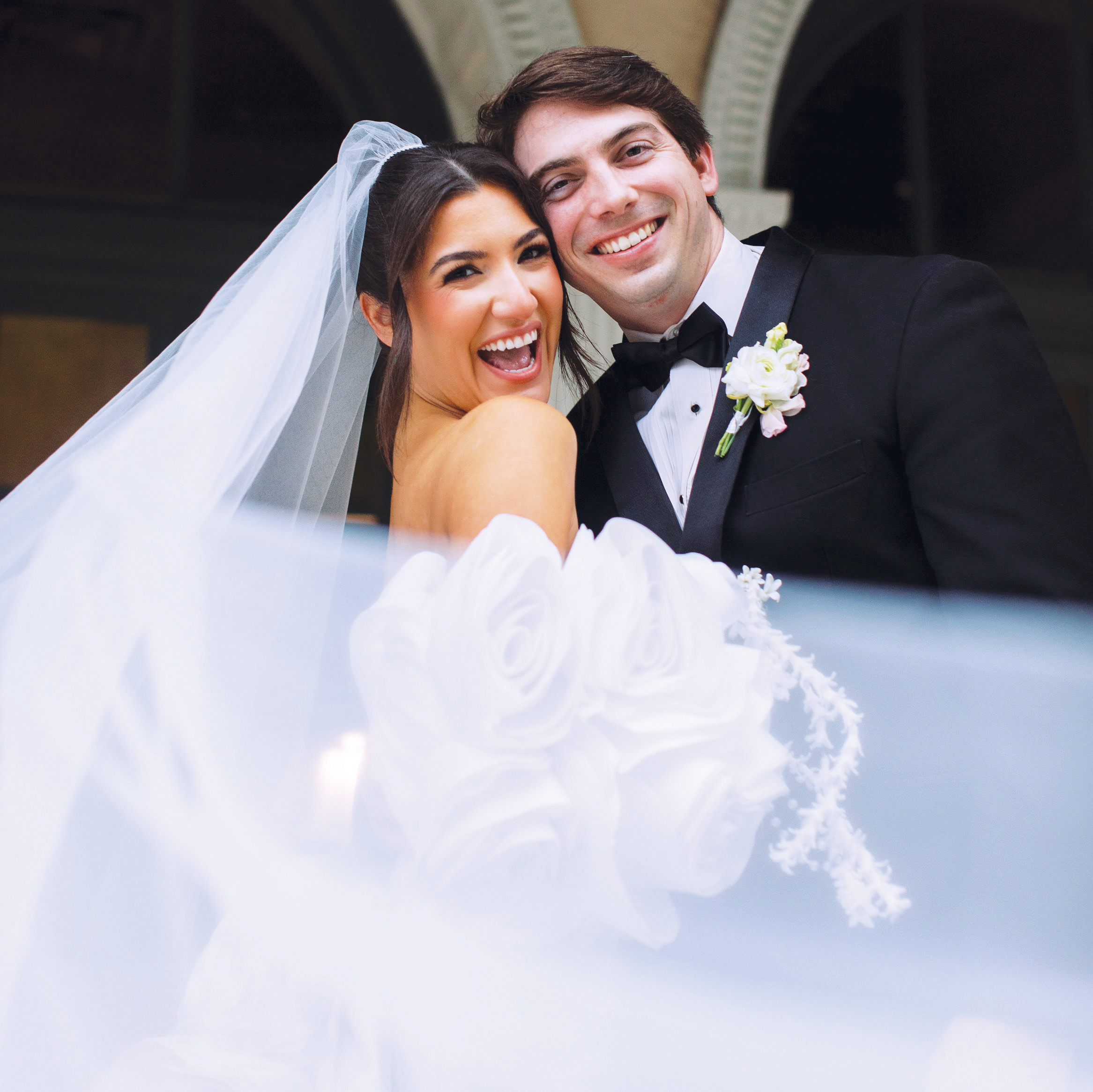 The bride wore a silk faille designer gown with a custom Mikado cape featuring sculptural rosettes. Sewn inside the gown was the handkerchief her mother carried on her wedding day, along with an embroidered state of Louisiana handkerchief. The bride also wore a pair of emerald and diamond earrings, a gift from her parents. Her cathedral veil was made of silk French tulle. The bride carried her late maternal grandmother’s pearl rosary, interwoven through a stem of Hyacinth, which was the street her family lived on when she was born.