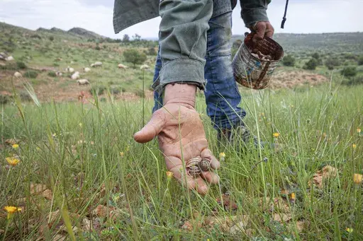 AKOUDA, Tunisia (AP) — In fields outside their hometown in central Tunisia, an increasing number of unemployed young men are seeking a new way to make a living, picking snails off of rocks and leaves and collecting them in large plastic bags to take to the local market to be sold.