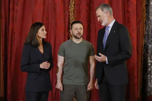 Spain’s King Felipe VI earlier welcomed Zelenskyy at the capital’s Barajas airport. Zelenskyy was due in neighboring Portugal on Tuesday.