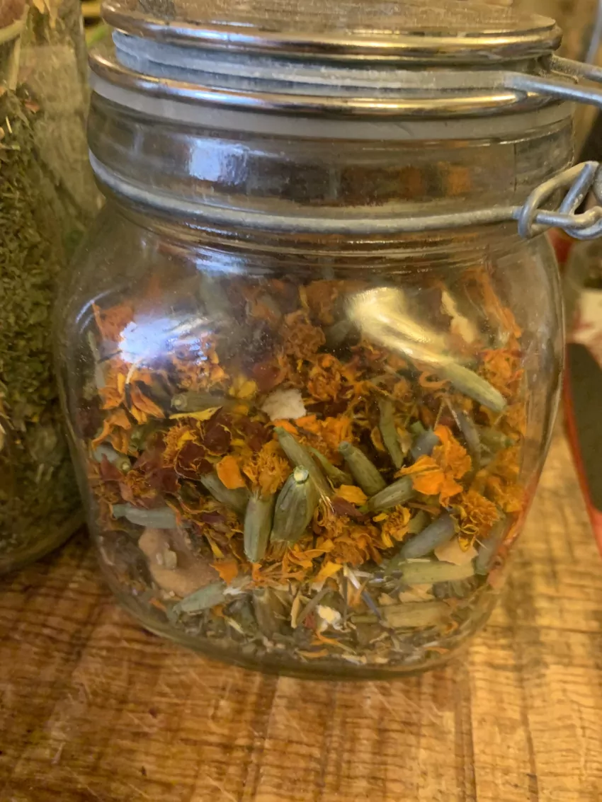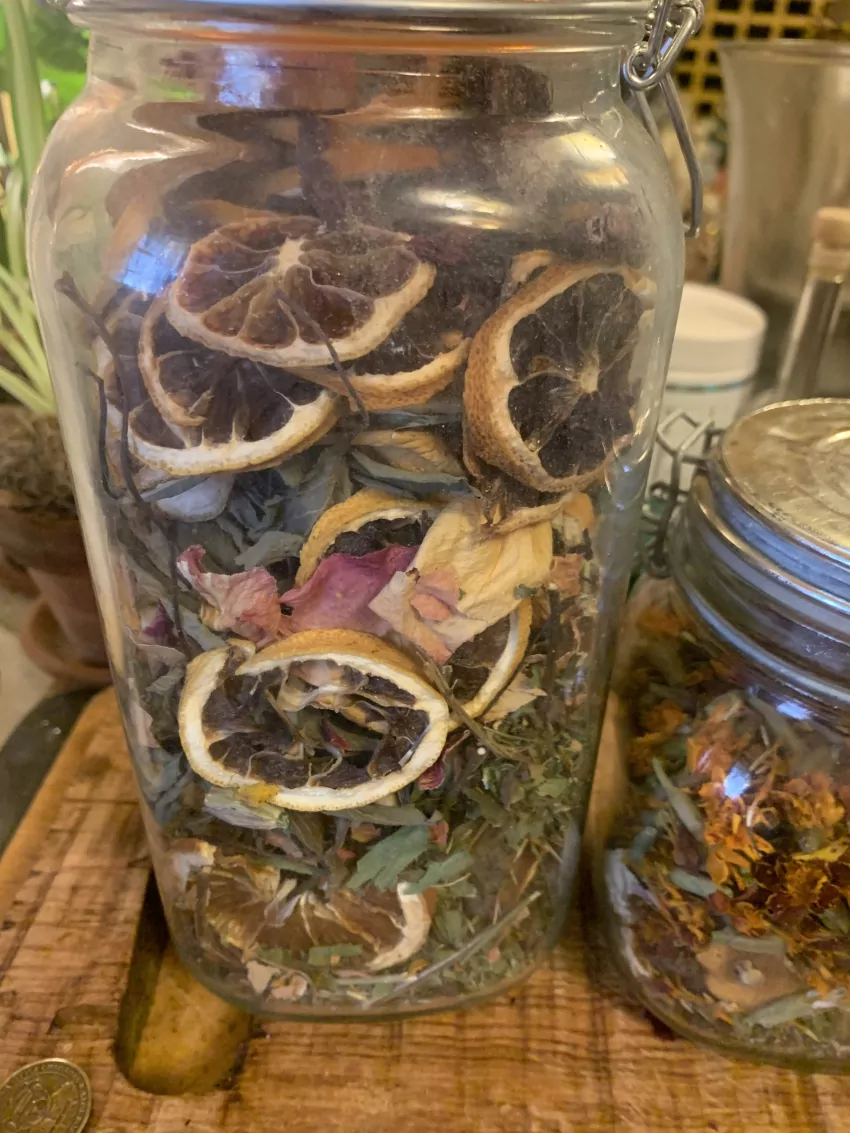 I enjoy drinking hot teas during cold weather. I make my own by dehydrating eatable flowers and other plants from the garden.