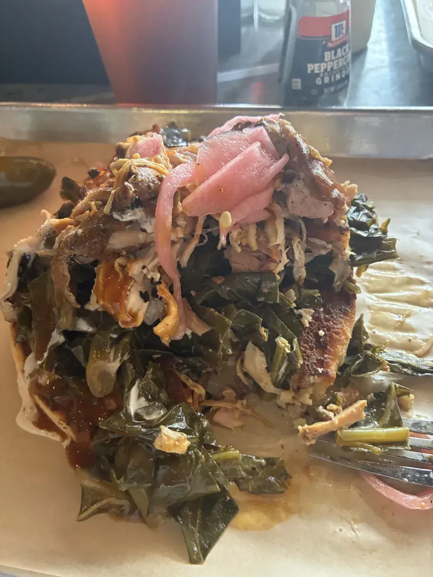 When exploring new area, we like to find where the locals go! A recommendation from my air conditioner guy lead us to the Hickory Hog in Lucedale MS! What a treat!. The Sope was a cornbread cake topped with fresh collard greens, pulled smoked chicken (or your chopped meat), pickled onions and a splash of BBQ sauce!