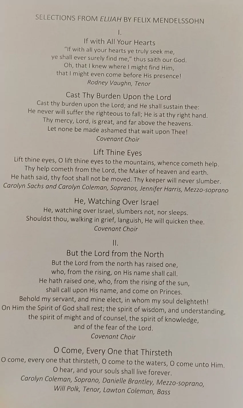 Stephen and Carolyn Sachs continue to produce awesome music each Sunday at Covenant Presbyterian Church in Jackson. This Sunday featured the gorgeous, lush compositions of Felix Mendelssohn.