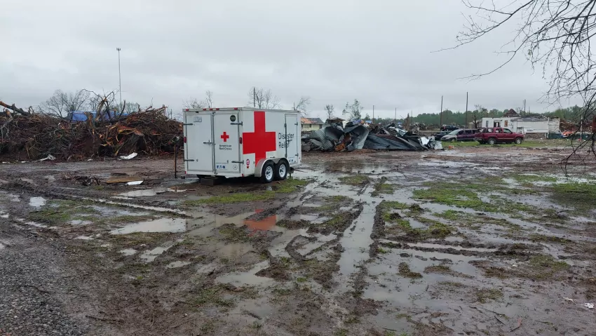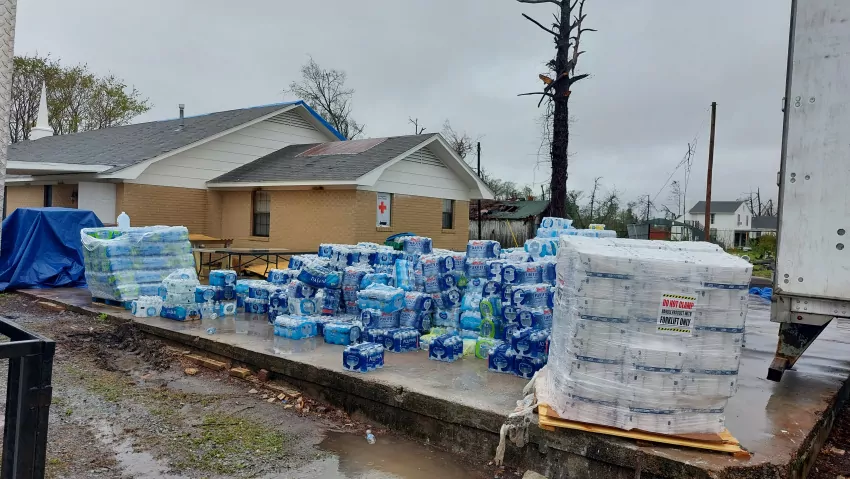 The First Baptist Church was packed with donated items. Red Cross had sign in procedures to prevent abuse.