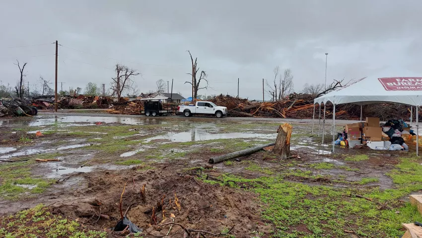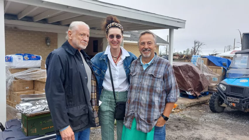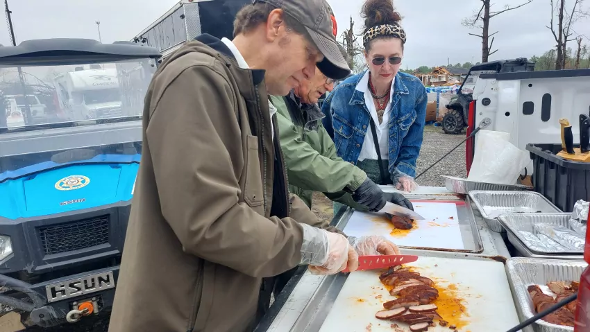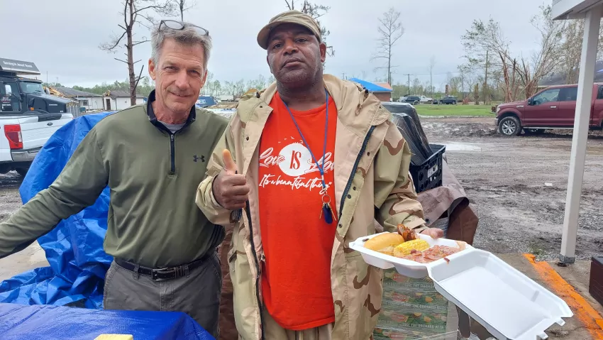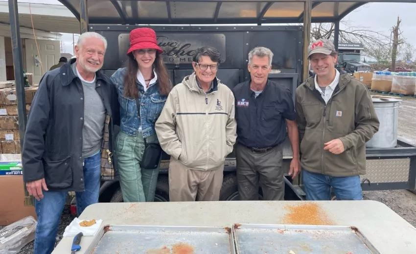 Silver City, being only 250 or so residents, has not gotten the attention of much bigger Rolling Fork, but it was equally destroyed by the recent E-4 tornado. Bob Crisler, Ted Dinkins, Ron and Anna Katherine Scott and I traveled there for a day to serve 80 lunch meals and 180 meals. Northminster Baptist Church and Greg Radar provided the funding. Ted brought an awesome smoking rig from his son's Starkville restaurant, Two Brothers Smoked Meats. Everyone was so appreciative and kind. A great example of the love and kindness of the people of our state. It was great food. Ted had just come back from New Orleans where his Hog Addiction cooking team won first place (out of 160 teams for the second year in a row!) in the Ochsner's Hog for A Cause event which raised $3.5 million for the treatment of pediatric brain tumors.