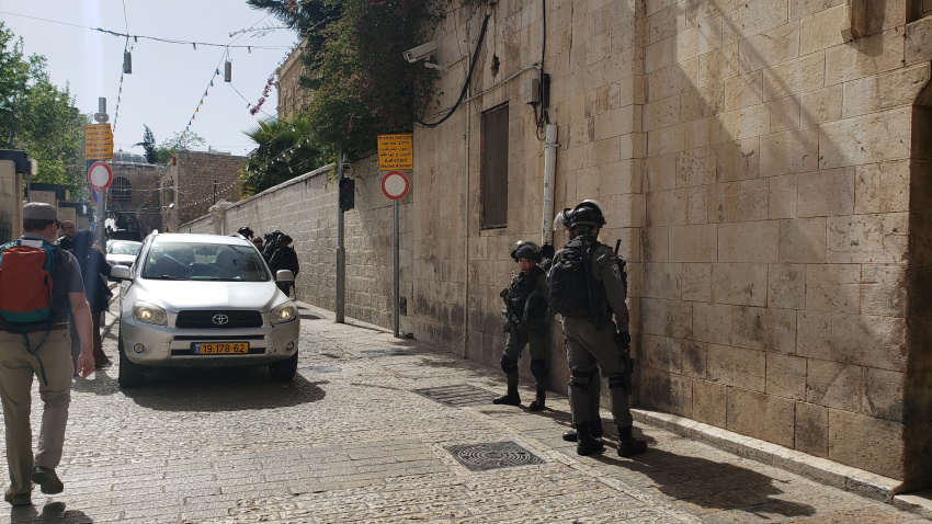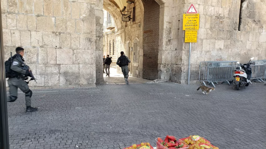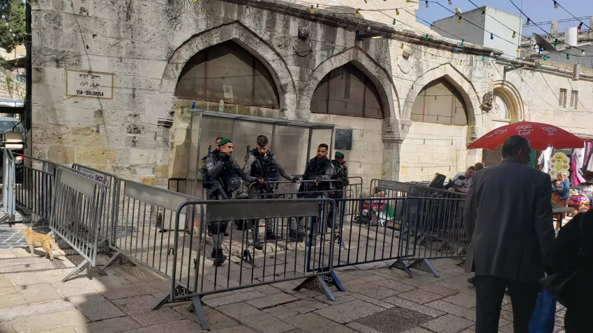 As we went through the Lions Gate, in the Muslim section of Jerusalem Old City, the first station on the Delarosa Way, the route Jesus was forced to carry his cross, something set off the Israeli soldiers.