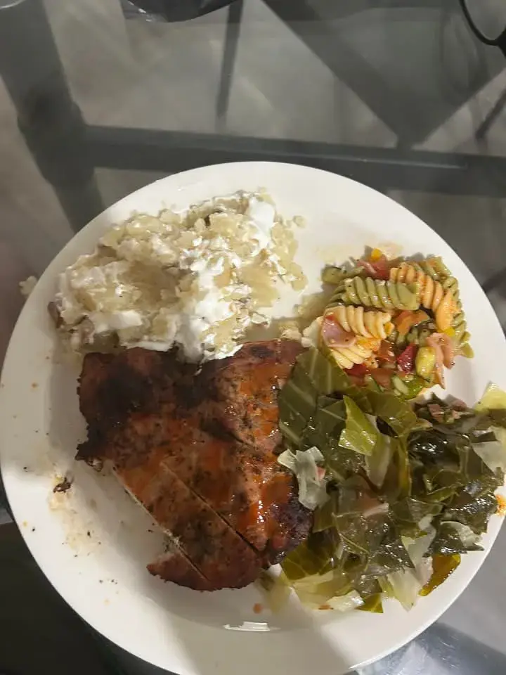 Grilled pork chops, cabbage greens, mashed potatoes and pasta salad.