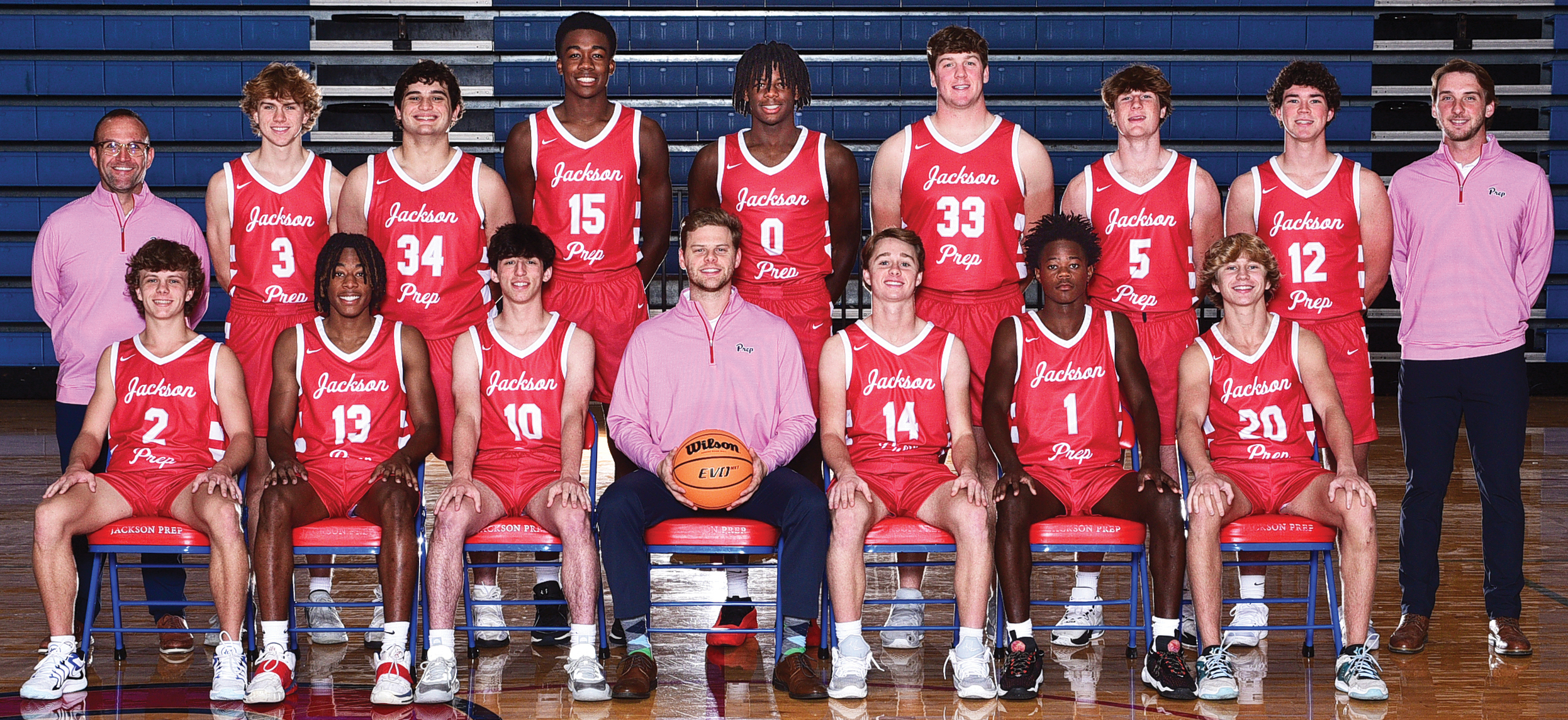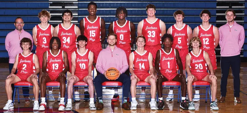 Members of Jackson Prep’s 2024 varsity boys basketball team included (from left, back) Coach Josh Glidewell, Cray Luckett, Thomas Coco, Joseph Chaney, Kevin Roberts, Cole Allen, John Ed Maddux, Ben Segrest, Coach Will Johnson; and (front) Ejay Napier, EJ Vaughn, Miles Burkhalter, Head Coach Zach Allison, William Thornton, De’Marion Tyler, Asher Reynolds.