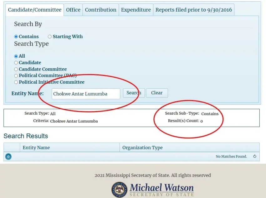 I went to the Mississippi Secretary of State’s website and clicked on Campaign Finance. I did a search for Chokwe Antar Lumumba. Nothing came up.